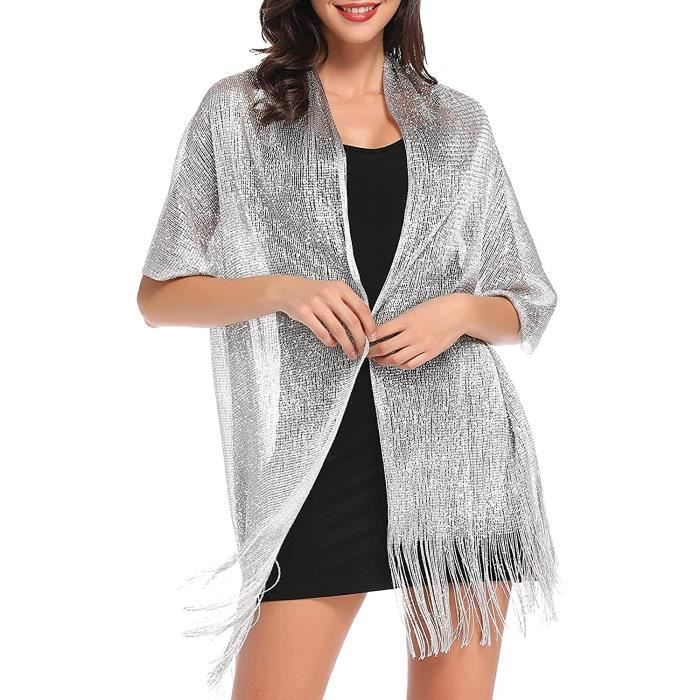 Un accessoire qui fait toute la différence pour une tenue de soirée ! Cette étole en viscose est légère, brillante et super douce. Dimensions : 200 x 50 cm, donc tu peux la porter de plein de façons – sur les épaules, en foulard, en châle…\n\nLe coloris argenté ajoute une touche glamour sans être trop flashy. Parfaite pour un mariage (mariée, demoiselle d’honneur, invitée), un bal de promo, un cocktail ou toute occasion habillée.\n\nElle se marie avec presque toutes les robes, et apporte juste ce qu’il faut de brillant pour être remarquée. En 100% viscose, elle ne pèse rien et se range facilement.\n\nUn indispensable dans ta penderie pour les événements spéciaux. Élégante, polyvalente, et vraiment jolie – tu ne la quitteras plus !